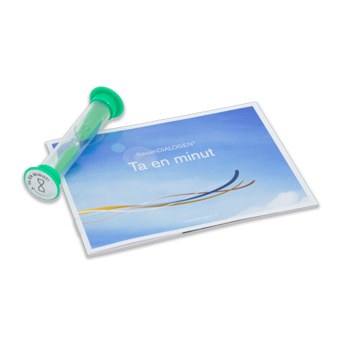 Ett enkelt verktyg för förbättrad kommunikation. Ett instruktionshäfte och ett minutglas som gör att dina reflektioner, din återhämtning, samtal eller andra möten får bättre kvalitet genom att stanna upp och lyssna på varandra.